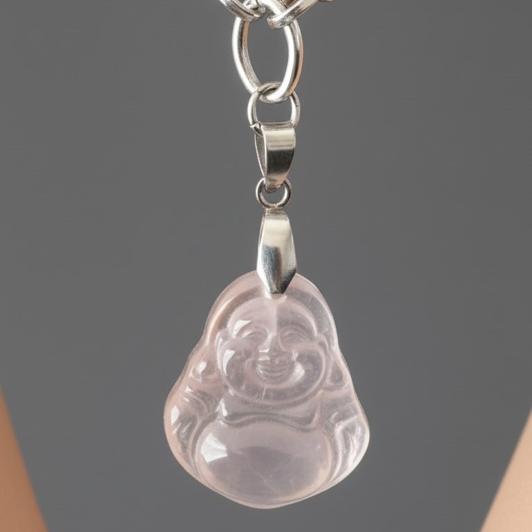 Joli collier sur chaine de 28.5cm avec Bouddha de 2.2cm en QUARTZ ROSE.
